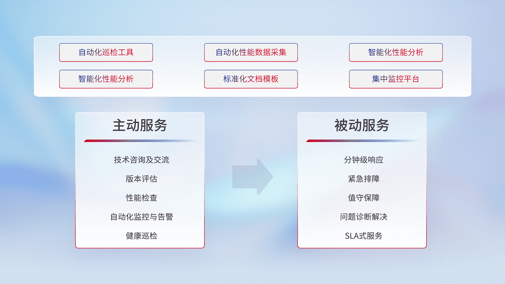 智能化工具和标准化文档,,保障服务质量,,,,提供主动服务(包含技术咨询、、、版本评估、、性能检查、、、、自动化监控与告警、、、、健康巡检)和被动服务包含(分钟级响应、、、、紧急排障、、值守保障、、、、问题诊断解决、、SLA服务)。。。。